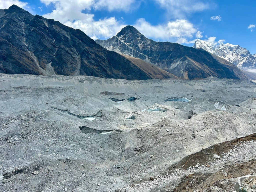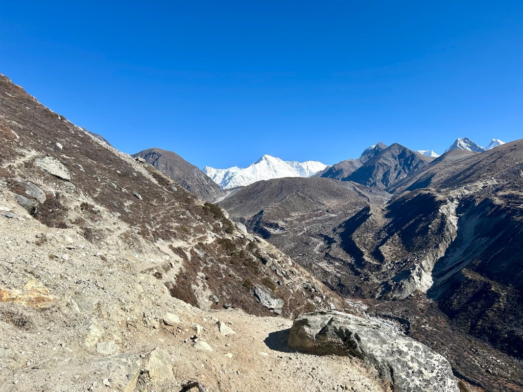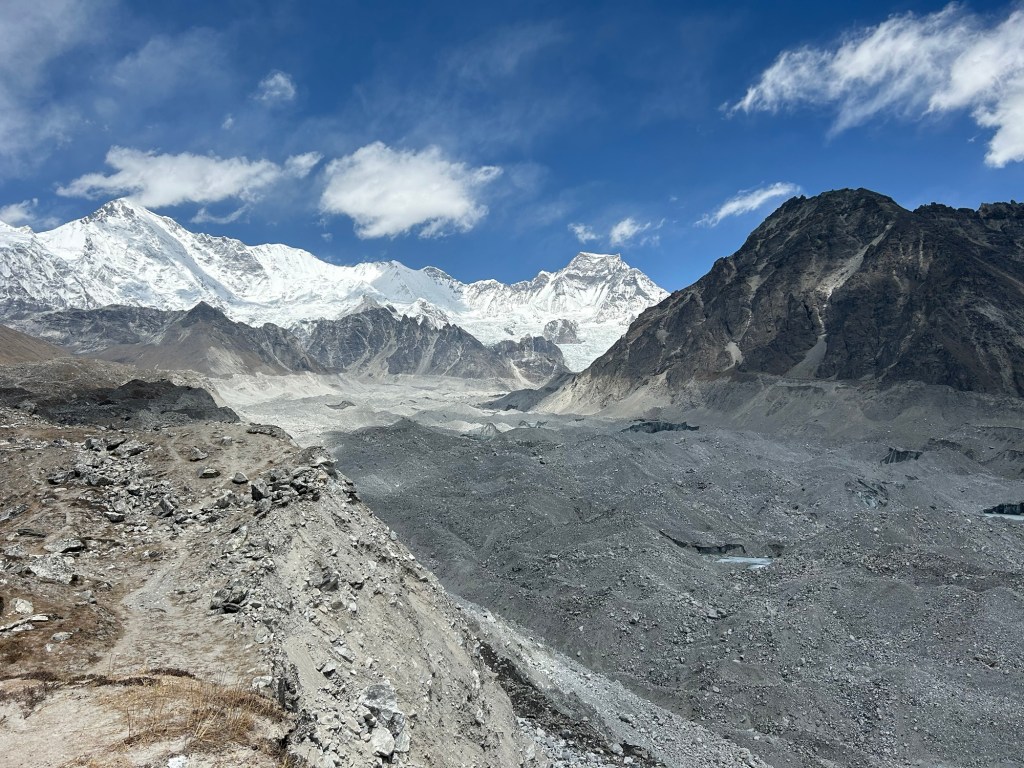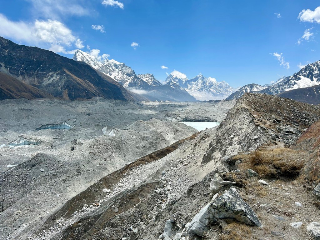 Po obědě jsme se ještě šli projít na 4. jezero. Byl odtud krásný výhled na Čo Oju 8201 metrů a táhnul se od něj v ohromné délce stékající ledovec.