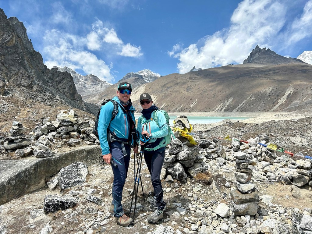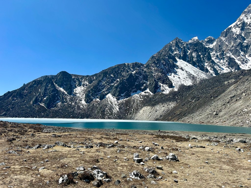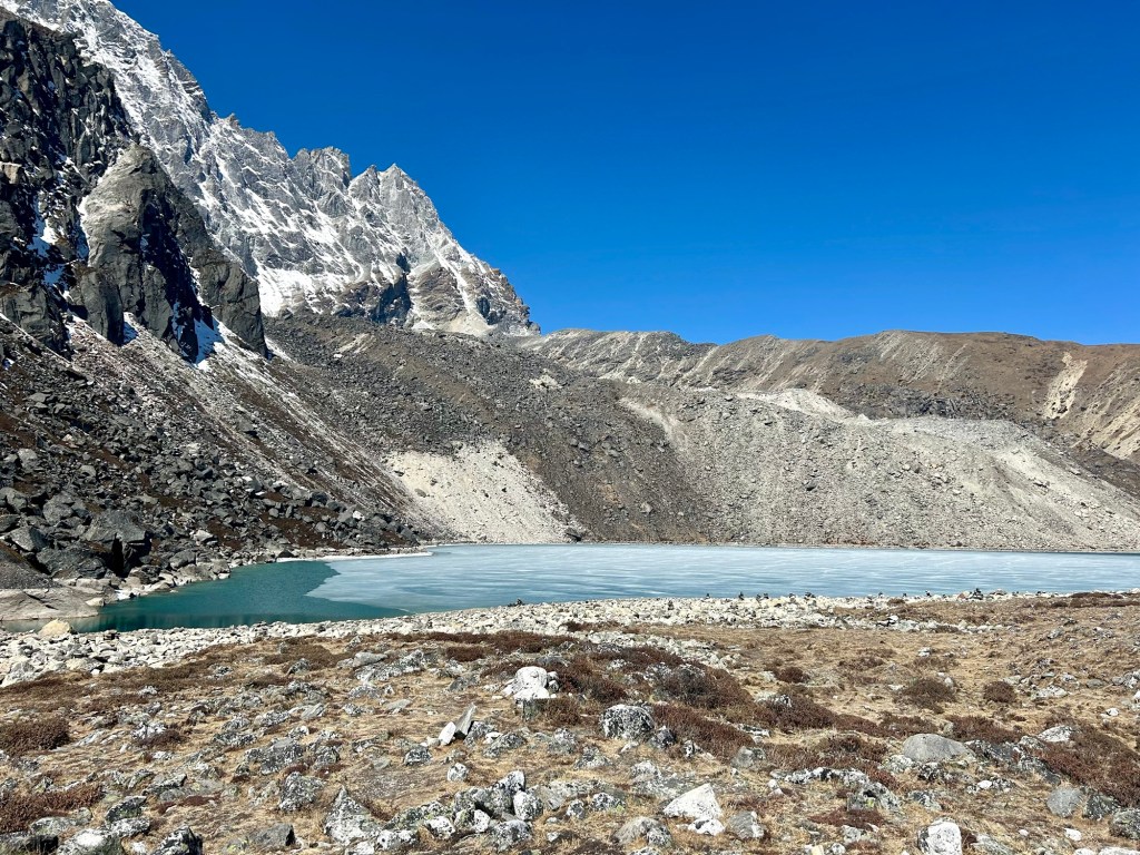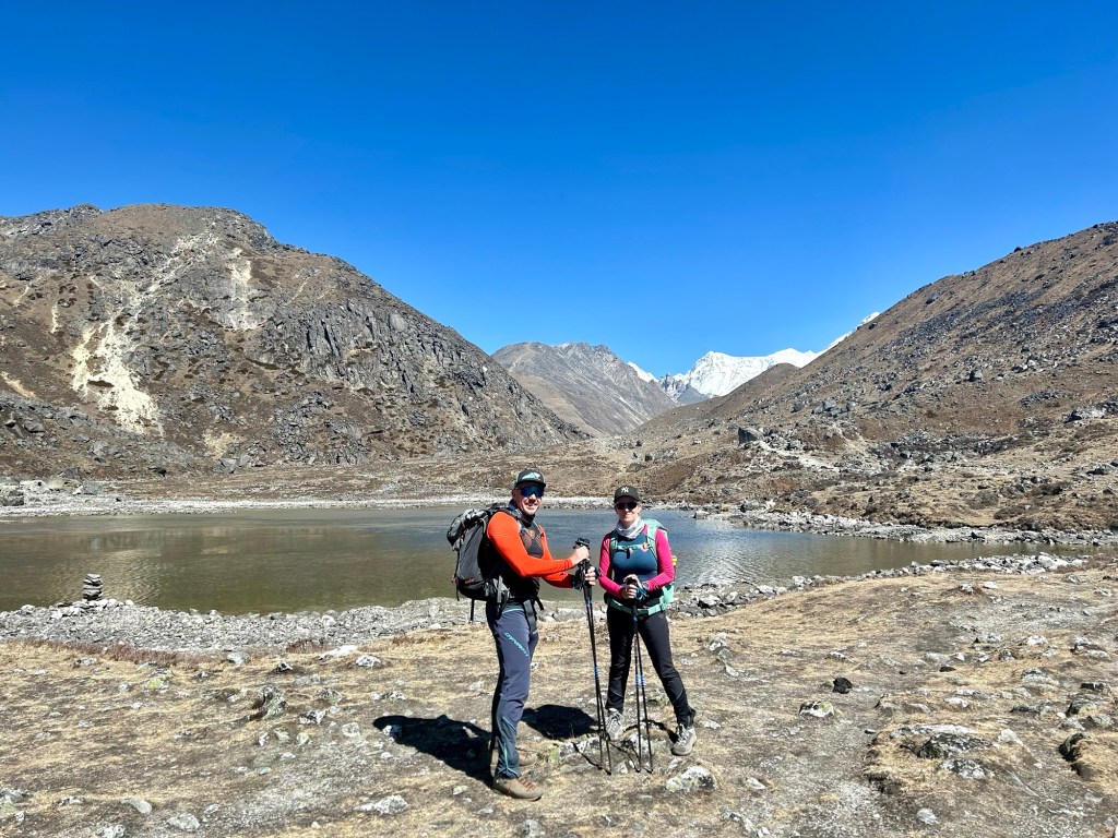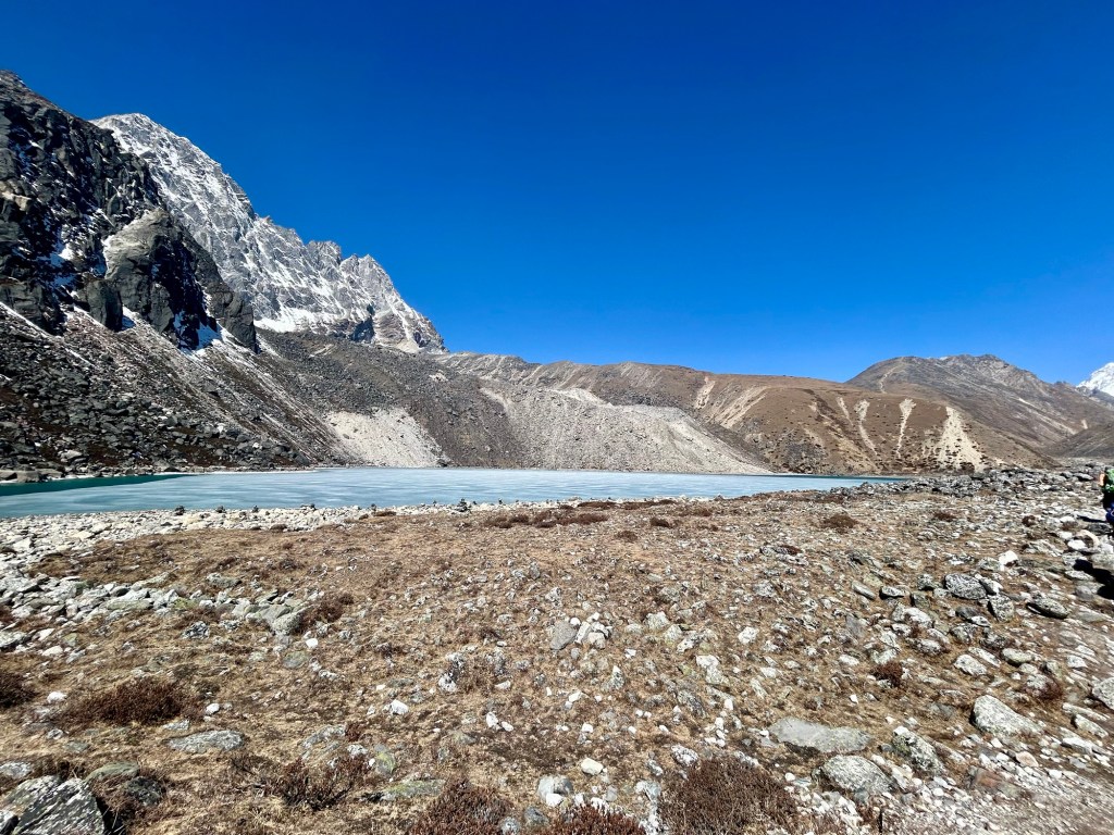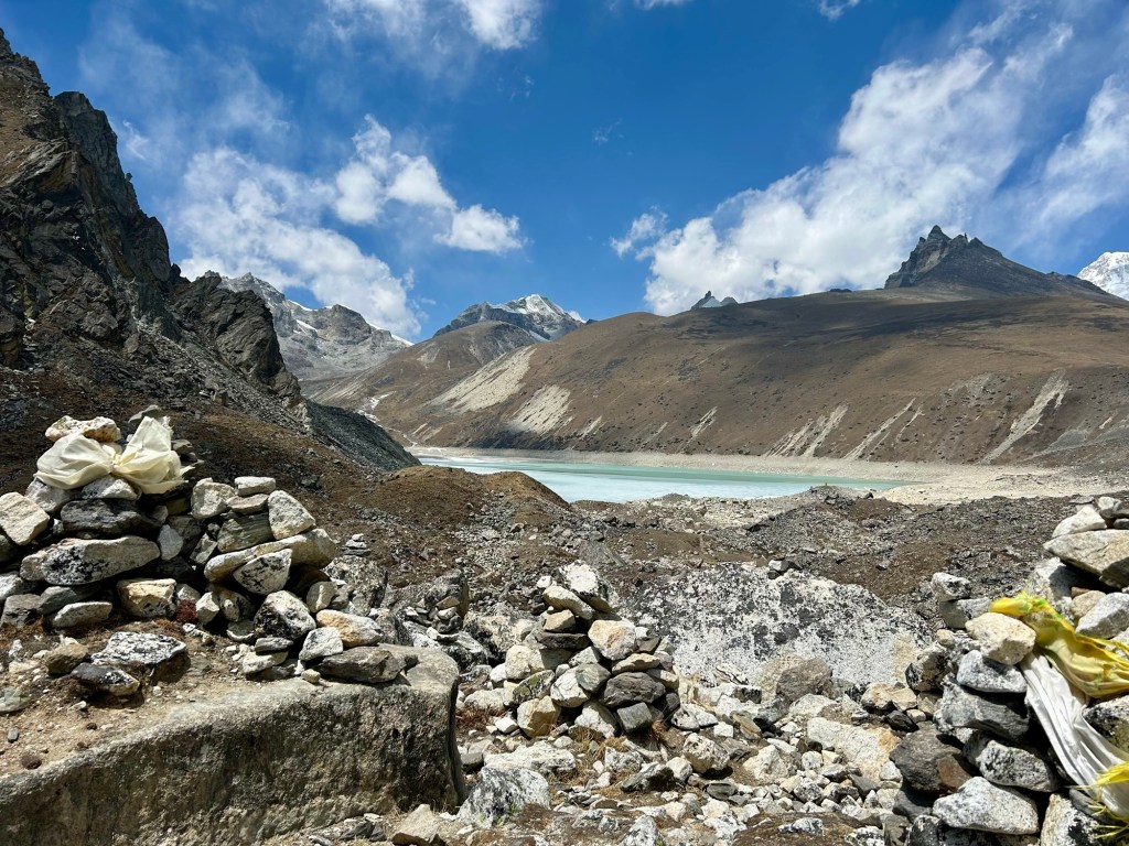 Cesta rychle utíká, za každou zatáčkou jsou trochu jiné výhledy a počasí je naprosto luxusní. Jak se blížíme ke Gokyu, potkáváme první a druhé jezero – jiný oficiální název nemají, až to třetí se jmenuje Gokyo. U druhého jezera potkáváme zase Australany, se kterými se občas míjíme. Je jim tak něco mezi 60 a 70 lety a pán na nás nadšeně volal, že skočil do jezera a že bylo tak neuvěřitelně studené, že se to nedá vůbec popsat 🙂