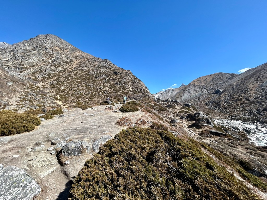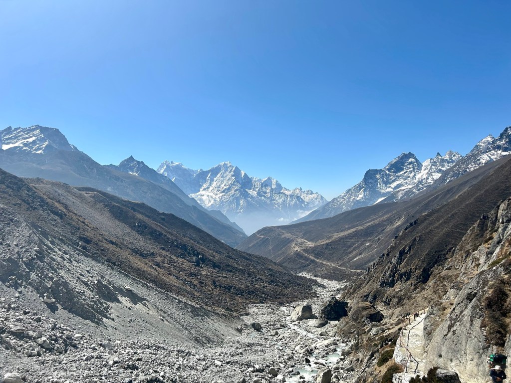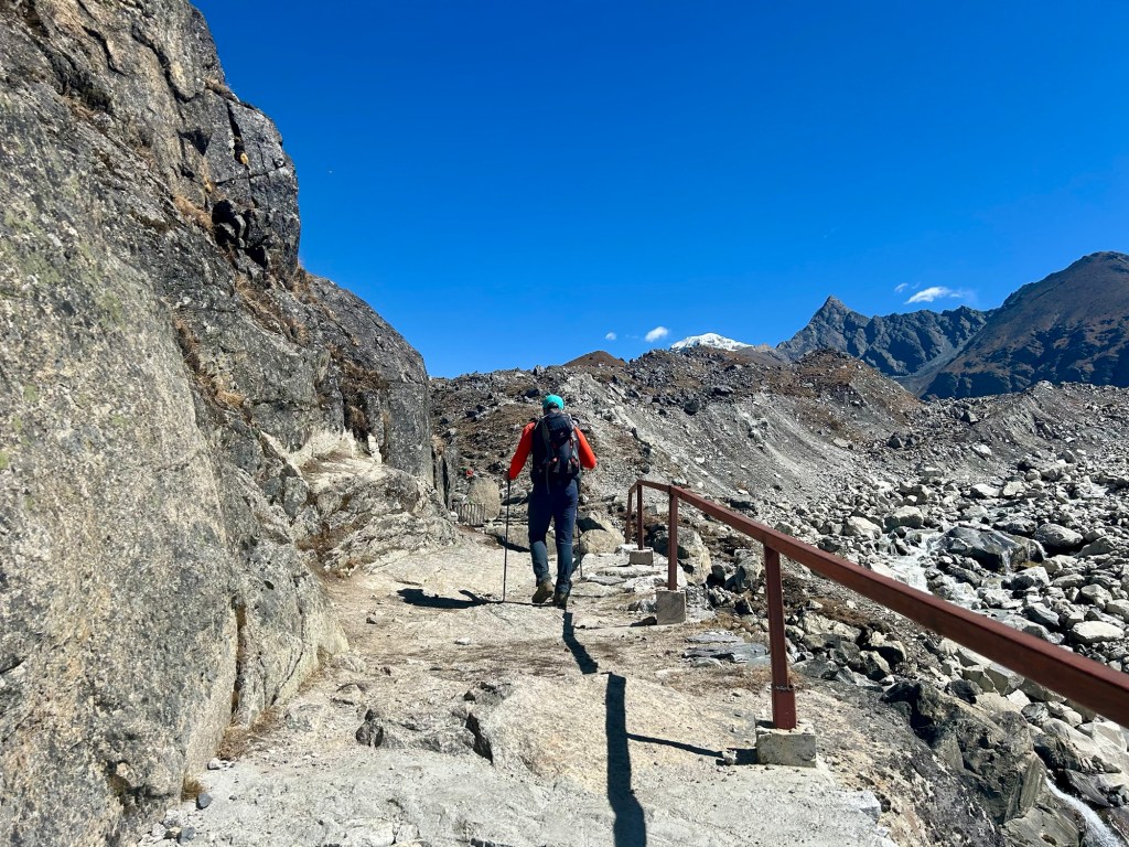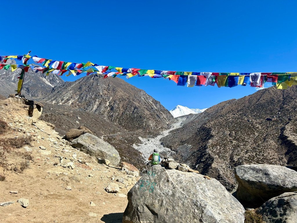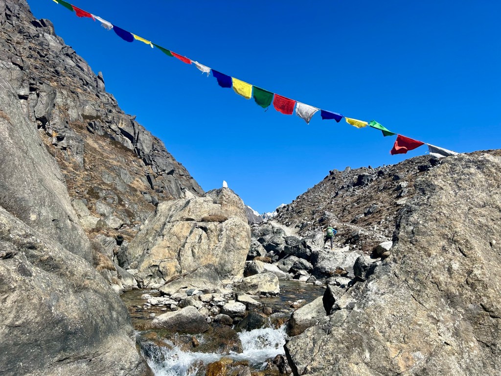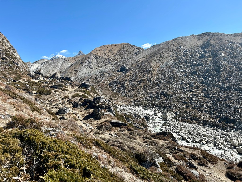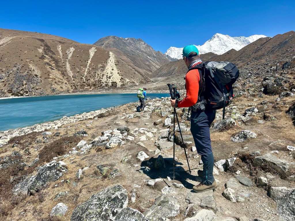 Cesta rychle utíká, za každou zatáčkou jsou trochu jiné výhledy a počasí je naprosto luxusní. Jak se blížíme ke Gokyu, potkáváme první a druhé jezero – jiný oficiální název nemají, až to třetí se jmenuje Gokyo. U druhého jezera potkáváme zase Australany, se kterými se občas míjíme. Je jim tak něco mezi 60 a 70 lety a pán na nás nadšeně volal, že skočil do jezera a že bylo tak neuvěřitelně studené, že se to nedá vůbec popsat 🙂