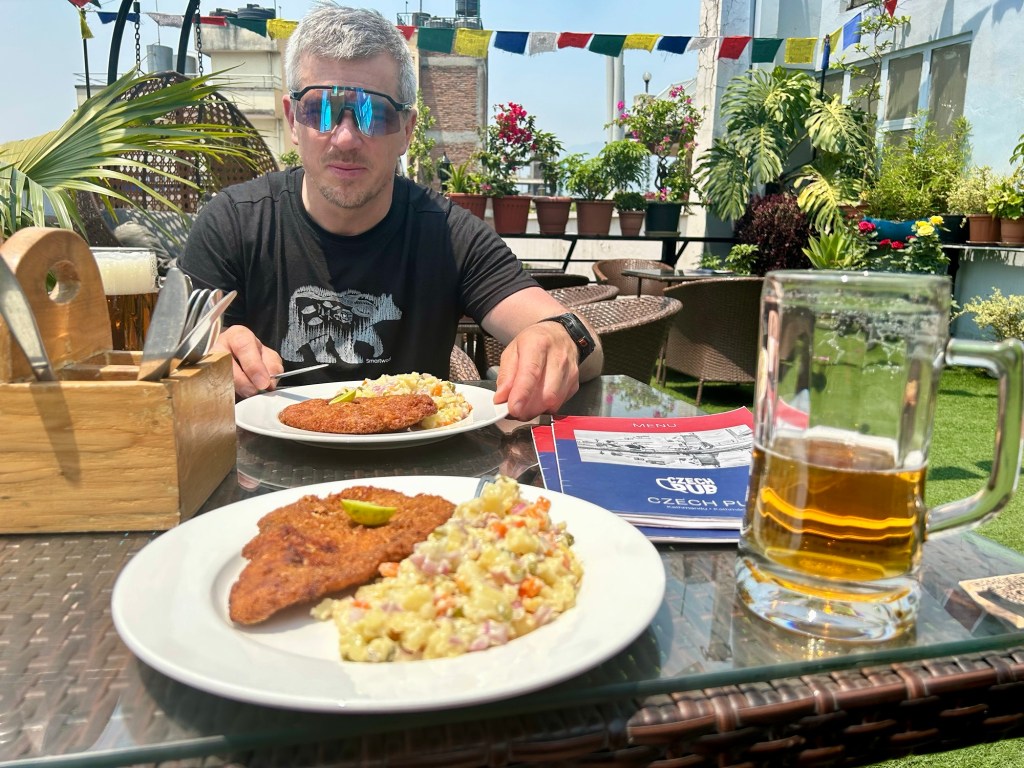 Do 10:00 jsme byli zpět v hotelu a po těch dnech v horách se nám Kathmandu zdálo překvapivě civilizovanější a hotel hezčí než když jsme přijeli. Bez meškání jsme vyrazili do Czech pubu na pořádné pivo a klasický řízek s bramborovým salátem.