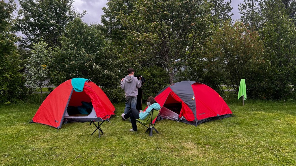 Naším prvním zastavením byl kemp v Hveragerði, kde jsme zjistili, že náš Šimon není zrovna mistr ve stavění stanu. Po několika komických pokusech a malé rodinné konferenci jsme stan přeci jen postavili. Abychom si trochu protáhli nohy po dlouhém letu, vyrazili jsme na krátkou procházku po okolí. Islandská příroda je opravdu nádherná, i když jen kolem kempu.